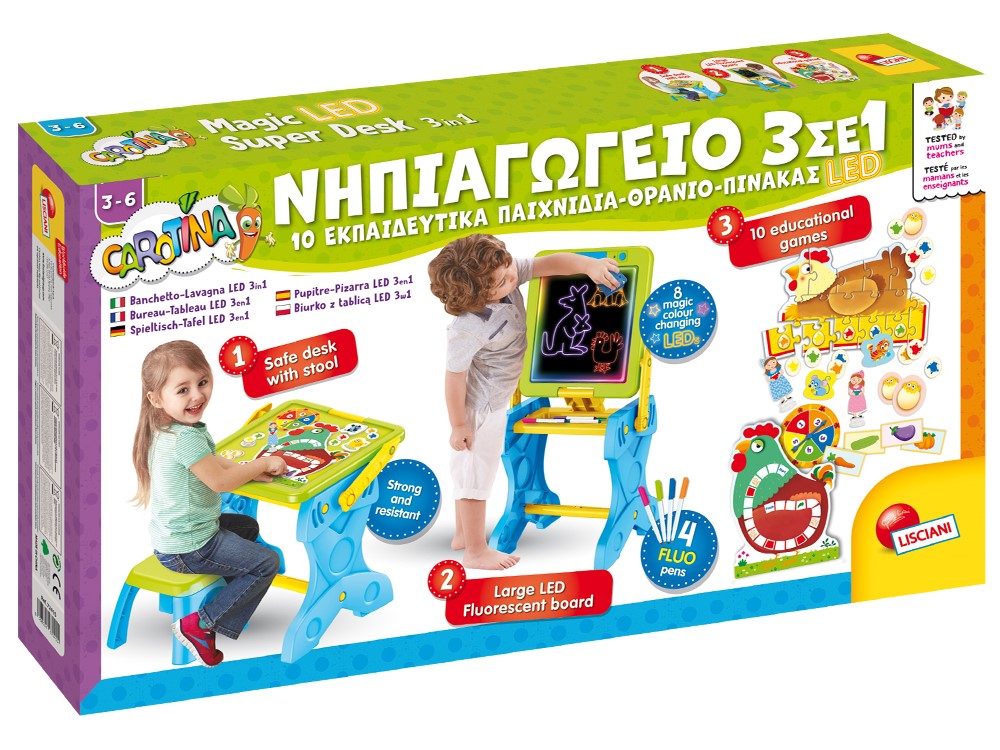 Ένα αποκλειστικό θρανίο με σκαμπό που μεταμορφώνεται με μία απλή κίνηση σε maxi πίνακα LED, για πραγματικά φανταστικά εφέ! Με 10 εκπαιδευτικά παιχνίδια και το παζλ "Μαμά Χήνα", 4 μαρκαδόρους φλούο και μια βολική γόμα. Μαθαίνεις, παίζεις και φωτίζεις τα σχέδιά σου. Περιεχόμενα:Θρανίο πίνακας, σκαμπό, 4 μαρκαδόροι φλούο, γόμα, ταμπλό διπλής όψεως "Κόκορας", τροχός με βελάκι.