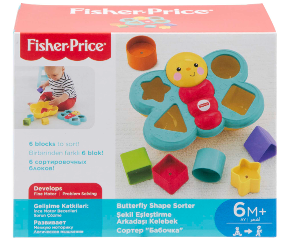 Aυτή η πεταλούδα της Fisher-Price® έχει έξι πολύχρωμα σχήματα για ταξινόμηση και παιχνίδι στο νερό! Ακόμα και το πιο μικρό σε ηλικία μωρό μπορεί να αφαιρέσει την κορυφή και να παίξει. Ταιριάζοντας τα σχήματα στα ανοίγματα, το μωρό διασκεδάζει και προσπαθεί να τα καταφέρει ξανά και ξανά, αναπτύσσοντας τις λεπτές κινήσεις του και το συντονισμό όρασης-κίνησής του. Η διαδικασία είναι τόσο διασκεδαστική που δε θα θέλει να σταματήσει. Είναι και ο ιδανικός τρόπος για να έρθει το μωρό σε πρώτη επαφή με τα σχήματα και τα χρώματα!