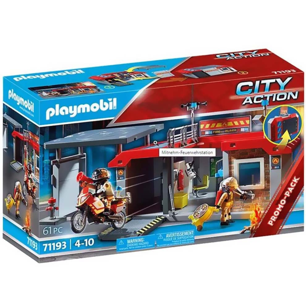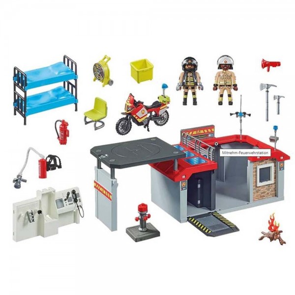 Σε πρακτική συσκευασία-βαλιτσάκι για να το έχετε πάντα μαζί σας. Περιλαμβάνει ελικοδρόμιο, μηχανή, δύο πυροσβέστες και ένα γκαράζ για τα πυροσβεστικά οχήματα.