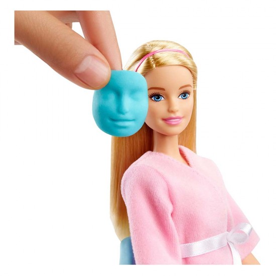 Το σετ προσώπου spa περιλαμβάνει κούκλα Barbie που φοράει ρόμπα και παπούτσια, κουτάβι, σταθμό σπα με χώρο αποθήκευσης και καλούπια, τρεις μπανιέρες ζύμης Barbie, κηλίδα, μια καρέκλα, ένα κρεβάτι για κατοικίδια και αξεσουάρ . Η κούκλα δεν μπορεί να μείνει μόνη της. Τα χρώματα και οι διακοσμήσεις μπορεί να διαφέρουν.