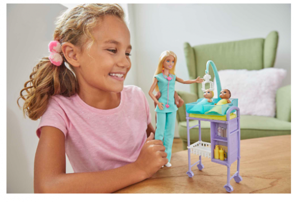 Εξερευνήστε έναν κόσμο φροντίδας με αυτό το σετ της Barbie®! Όταν ένα κορίτσι παίζει με την Barbie, φαντάζεται όσα μπορεί να γίνει όταν μεγαλώσει και αν της αρέσει να φροντίζει μωράκια, μπορεί να γίνει παιδίατρος! Το σετ περιλαμβάνει όσα χρειάζεται η Barbie για να φροντίζει τα αξιολάτρευτα μωράκια! Οι παιδίατροι είναι ευγενικοί και έξυπνοι και βοηθάνε τα μωρά να μένουν υγιή και χαρούμενα. Με έπιπλο εξέτασης, μπουκαλάκι λοσιόν, αξεσουάρ, ένα περιστρεφόμενο και δύο κρεβατάκια για τα μωράκια. Η Barbie μπορεί να ακούσει τους χτύπους της καρδιάς των μωρών με το στηθοσκόπιο και να σημειώσει στο διάγραμμα. Είναι πολύ υγιή! Το σετ περιλαμβάνει την κούκλα Barbie® Παιδίατρο με πράσινα ιατρικά ρούχα, στηθοσκόπιο και διάγραμμα, και 2 μωράκια τυλιγμένα σε κουβερτούλες. Επιπλέον περιλαμβάνονται έπιπλο εξέτασης με μπουκαλάκι λοσιόν, αξεσουάρ περιστεφόμενο και κρεβατάκια για τα μωράκια. Τα παιδιά θα εκφραστούν δημιουργικά και θα εμπνευστούν πολλές ιστορίες! Η κούκλα δεν μπορεί να σταθεί όρθια από μόνη της. Τα χρώματα και τα σχέδια μπορεί να διαφέρουν. Για ηλικίες 3 ετών και άνω.