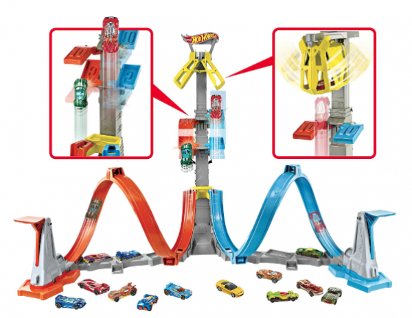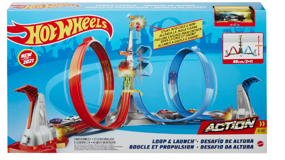 Η σετ πίστας Hot Wheels® Διπλή Εκτόξευση & Λουπ πάει τον ανταγωνισμό σε άλλο επίπεδο, καθώς τα αυτοκίνητα αγωνίζονται για το ποιο θα φτάσει πρώτο στο κλουβί του νικητή, που υψώνεται μέχρι και 65 εκ.! Τα αυτοκίνητα τρέχουν μέσα από ένα ελικοειδές λουπ και εκτοξεύονται προς το κελί που κλείνει απότομα μόλις το φτάσει το πρώτο αυτοκίνητο. Το κελί εναι ρυθμιζόμενο και μπορεί να ανυψωθεί ή να χαμηλώσει ανάλογα με το επιθυμητό επίπεδο ανταγωνισμού. Τα διαφορετικά σημεία τερματισμού κατά μήκος της πορείας κάνουν την πρόκληση ακόμα πιο συναρπαστική. Κάθε διαδρομή μπαίνει και βγαίνει εύκολα από τη θέση της και διπλώνει για εύκολη αποθήκευση. Περιλαμβάνει ένα αυτοκίνητο Hot Wheels® κλίμακας 1:64 και είναι το πιο θεαματικό δώρο για παιδιά 5 έως 10 ετών. Τα χρώματα και τα σχέδια μπορεί να διαφέρουν από αυτά που φαίνονται.