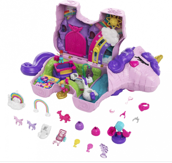 Πείτε ναι στο πιο διασκεδαστικό πάρτι έκπληξη της Polly Pocket™! Σε σχήμα μονόκερου-πινιάτα, αυτό το μεγάλο σετ έχει λαμπερά φτερά που επεκτείνονται και μία λαβή για να το παίρνετε μαζί σας! Ξεκινήστε το πάρτι τραβώντας την προεξοχή και δείτε το πολύχρωμο κομφετί και πάνω από 25 εκπλήξεις να πέφτουν από το σετ! Ουάου! Είναι το πιο ωραίο πάρτι! Μερικές ακόμα εκπλήξεις περιμένουν να τις ανακαλύψετε! Πολλές εκπλήξεις έχουν ειδικό σχεδιασμό για να μπορείτε να τις τοποθετήσετε μέσα στο σετ! Το σετ ανοίγει για να αποκαλύψετε απίθανα σημεία για να διασκεδάσετε μαζί με την Polly και τη Lila! Εξερευνήστε το παλάτι της πριγκίπισσας που ανοίγει για να αποκαλύψει έναν γοητευτικό θρόνο και υπνοδωμάτιο. Χοροπηδήστε στο φουσκωτό σπιτάκι, κάντε τραμπάλα ή τσουλήθρα πάνω-κάτω στο ουράνιο τόξο, βάλτε εκπλήξεις στον αποθηκευτικό χώρο, απολαύστε μία βόλτα στο ποτάμι με τον μονόκερο και άλλα πολλά! Τα αξεσουάρ μπορούν να χρησιμοποιηθούν στο εσωτερικό και στο εξωτερικό του σετ και περιλαμβάνουν: 2 μονόκερους και μία άμαξα, έναν δράκο, μια κούνια με λουλούδια. μια κούνια γλειφιτζούρι. μπαλόνι, κολιέ και δαχτυλίδι (ορισμένα αξεσουάρ μπορούν να φορεθούν στο κολιέ ή να μπουν μέσα στο δαχτυλίδι), 2 τιάρες 2 φούστες πριγκίπισσας: 2 γλειφιτζούρια που μπορούν να κρατήσουν οι κούκλες και άλλα! Ένα πολύχρωμο και πανέμορφο πριγκιπικό πάρτι! Χάρη στην τεχνολογία Polly Stick™, οι μικρές κούκλες μπορούν να κολλήσουν σε οποιοδήποτε σημείο του σετ. Τοποθετήστε ένα από τα αυτοκόλλητα (περιλαμβάνονται) σε κάποιο σημείο του σετ και οι κούκλες θα κολλήσουν πάνω του όπου και αν το βάλετε. Τέλειο δώρο σε γενέθλια και γιορτές για παιδιά 4 ετών και άνω, ειδικά για εκείνα που αγαπούν τους μονόκερους και τις εκπλήξεις! Τα χρώματα και τα σχέδια μπορεί να διαφέρουν.