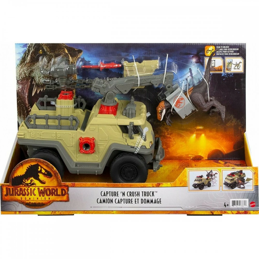 Jurassic World Movie Όχημα Capture & Crush (GWD66). Εμπνευσμένο από την περιπέτεια και τις συγκινήσεις του Jurassic World: Dominion, αυτό το Capture 'N Crush Truck™ έχει μήκος περίπου 12 ιντσών, με ένα απίστευτο πλήθος ενεργών χαρακτηριστικών παιχνιδιού που φέρνουν το δράμα στο σπίτι! Το όχημα διαθέτει κυλιόμενες ρόδες και ένα μεγάλο εκρηκτικό που είναι τοποθετημένο στην κορυφή για να εντοπίζει και να ηρεμεί τους ελεύθερους δεινοσαύρους. Ένας περιστρεφόμενος γερανός μπορεί να σηκώσει τον δεινόσαυρο πάνω στο μεγάλο κρεβάτι για μεταφορά, ενώ τεντωμένες αλυσίδες τον κλειδώνουν! Όταν τα μεγάλα πλάσματα αντεπιτίθενται, υπάρχει δράση συντριβής με αποσπώμενα μέρη, όπως το πλευρικό τμήμα και η μπροστινή καμπίνα! Περιλαμβάνεται η φιγούρα του Βελοσιράπτορα για να ξεκινήσετε αμέσως το παιχνίδι. Κατεβάστε τη δωρεάν εφαρμογή Jurassic World Facts (Android και iOS) και δείτε το παιχνίδι με τους δεινόσαυρους να γίνεται πραγματικό! Βρείτε τον κρυμμένο κωδικό του αρπακτικού και σαρώστε τον με οποιαδήποτε έξυπνη συσκευή.