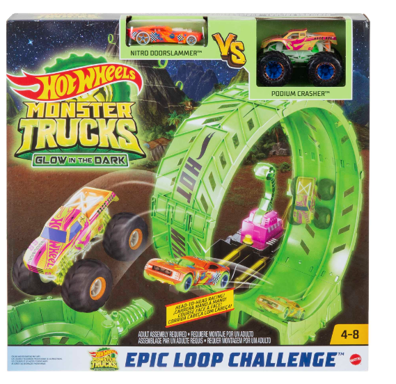 Αυτό το σετ Hot Wheels® Monster Trucks προσφέρει επικές αγωνιστικές προκλήσεις, που γίνονται ακόμα πιο συναρπαστικές όταν σβήνουν τα φώτα! Τα μπλε, πράσινα και κίτρινα μέρη του σετ λάμπουν στο σκοτάδι για να φωτίσουν τη δράση στην πίστα. Εκτοξεύστε τα οχήματα δίπλα-δίπλα για να αγωνιστούν γύρω από το λουπ, να πηδήξουν μέσα στο κύπελλο και να διεκδικήσουν τη νίκη! Περιλαμβάνονται ένα Hot Wheels® monster truck και ένα αυτοκινητάκι κλίμακας 1:64 για να ξεκινήσετε αμέσως τους αγώνες και τις συγκρούσεις. Επιπλέον, λάμπουν και στο σκοτάδι! Ιδανικό δώρο για παιδιά ηλικίας 4 έως 8 ετών. Δεν χρησιμοποιείται με ορισμένα αυτοκίνητα Hot Wheels®. Τα χρώματα και τα σχέδια μπορεί να διαφέρουν.