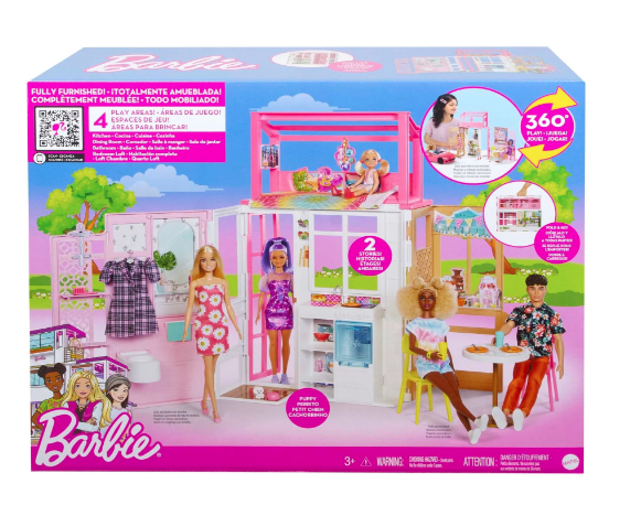 Όταν τα παιδιά ανοίξουν την πόρτα στο Σπίτι της Barbie®, θα ανακαλύψουν απίθανους χώρους και θα εμπνευστούν αμέτρητες ιστορίες! Τα παιδιά μπορούν να μαγειρέψουν στην κουζίνα που έχει φούρνο που ανοίγει και κλείνει, νεροχύτη και ράφια για ρεαλιστικό παιχνίδι. Όταν έρθει η ώρα για χαλάρωση, ανεβείτε στο δωμάτιο με το κρεβάτι που έχει μαλακό πολύχρωμο πάπλωμα και τηλεόραση. Ετοιμαστείτε για άλλη μια μέρα παιχνιδιού στο μπάνιο που έχει ντους με ράφια για την αποθήκευση αξεσουάρ και χώρο για να κρεμάσετε ρούχα. Γυρίστε το σετ για να ανακαλύψετε παιχνίδι 360 μοιρών με γραφικά που δημιουργούν το σκηνικό για πολλές ιστορίες και μια εξωτερική αυλή, ιδανική για διασκέδαση! Φανταστείτε και άλλες ιστορίες με αξεσουάρ όπως μαγειρικά σκεύη, αξεσουάρ φαγητού, ένα σκυλάκι με το μπολ του και πολλά άλλα. Όταν τελειώσει το παιχνίδι, διπλώστε το σετ και αποθηκεύστε τα πάντα μέσα για να διασκεδάσετε όπου θέλετε! Με τόσα διασκεδαστικά χαρακτηριστικά και χώρους παιχνιδιού, αυτό το σετ Barbie είναι ιδανικό δώρο για παιδιά ηλικίας 3 ετών και άνω. Συλλέξτε και άλλες κούκλες και σετ Barbie για να συμπληρώσετε το σπίτι, για αμέτρητες ιστορίες! Το καθένα πωλείται ξεχωριστά, ανάλογα με τη διαθεσιμότητα.