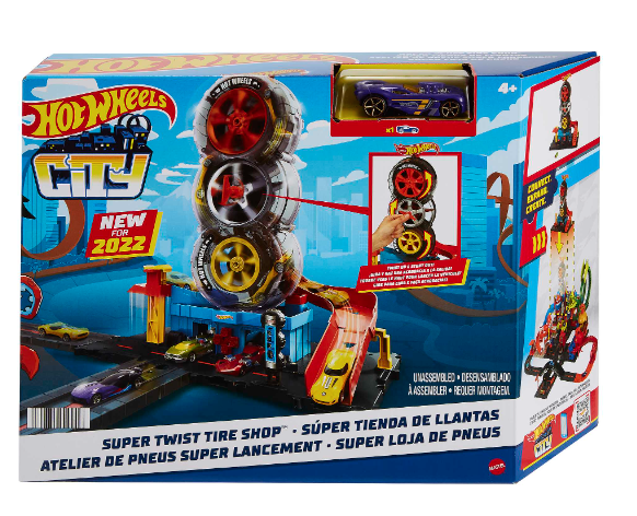 Τα παιδιά αντιμετωπίζουν πολλαπλές ανατροπές στο Hot Wheels™ Πίστα City με Περιστρεφόμενες Ρόδες καθώς περιστρέφουν το κεντρικό κλειδί και περνούν τα αυτοκίνητά τους μέσα από τους ημιδιαφανείς τροχούς του καταστήματος. Μόλις φτάσουν στην κορυφή, κατεβαίνουν από τη ράμπα και ξεκινούν νέες περιπέτειες. Η βάση του σετ συνδέεται με άλλα σετ Hot Wheels® και μπορεί να χρησιμοποιηθεί με πρόσθετα κομμάτια πίστας Hot Wheels®, ώστε τα παιδιά να μπορούν να δημιουργήσουν τον δικό τους κόσμο ακροβατικών και αγώνων (τα επιπλέον σετ και οι πίστες πωλούνται ξεχωριστά). Περιλαμβάνεται ένα αυτοκίνητο Hot Wheels®, αλλά μπορούν να κινούνται μέχρι τέσσερα ταυτόχρονα μέσα από την κατασκευή (τα επιπλέον αυτοκίνητα πωλούνται ξεχωριστά). Ρεαλιστικές λεπτομέρειες, όπως ο ανελκυστήρας που μπορούν να ενεργοποιήσουν τα παιδιά, η βιτρίνα με τις περιστρεφόμενες ρόδες και η αντλία βενζίνης, κάνουν την περιπέτεια ακόμα πιο διασκεδαστική. Τα χρώματα και τα σχέδια μπορεί να διαφέρουν.