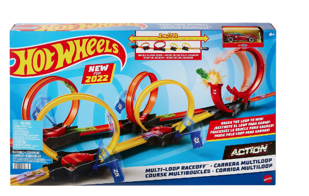 - Η Πίστα Hot Wheels® για Κόντρες με Πολλαπλά Λουπ παίζεται με έναν ή δύο παίκτες. Μετρήστε το σκορ με τις σημαίες που κατεβαίνουν αυτόματα όταν περνάει το αυτοκίνητο.
