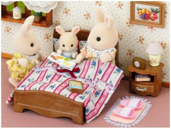 Αυτό το ημίδιπλο κρεβάτι είναι ιδανικό για τα Κυριακάτικα πρωινά και τις στιγμές χαλάρωσης των Sylvanians. Αυτό το σκούρο καφέ σετ κρεβατιού με κομοδίνο διαθέτει επίσης εμπριμέ λουλουδένια σεντόνια, κουβέρτα και ασορτί μαξιλάρι. Περιλαμβάνονται επίσης δύο βιβλία, ένα κομοδίνο με πλήρες συρτάρι, λυχνία και ξυπνητήρι!