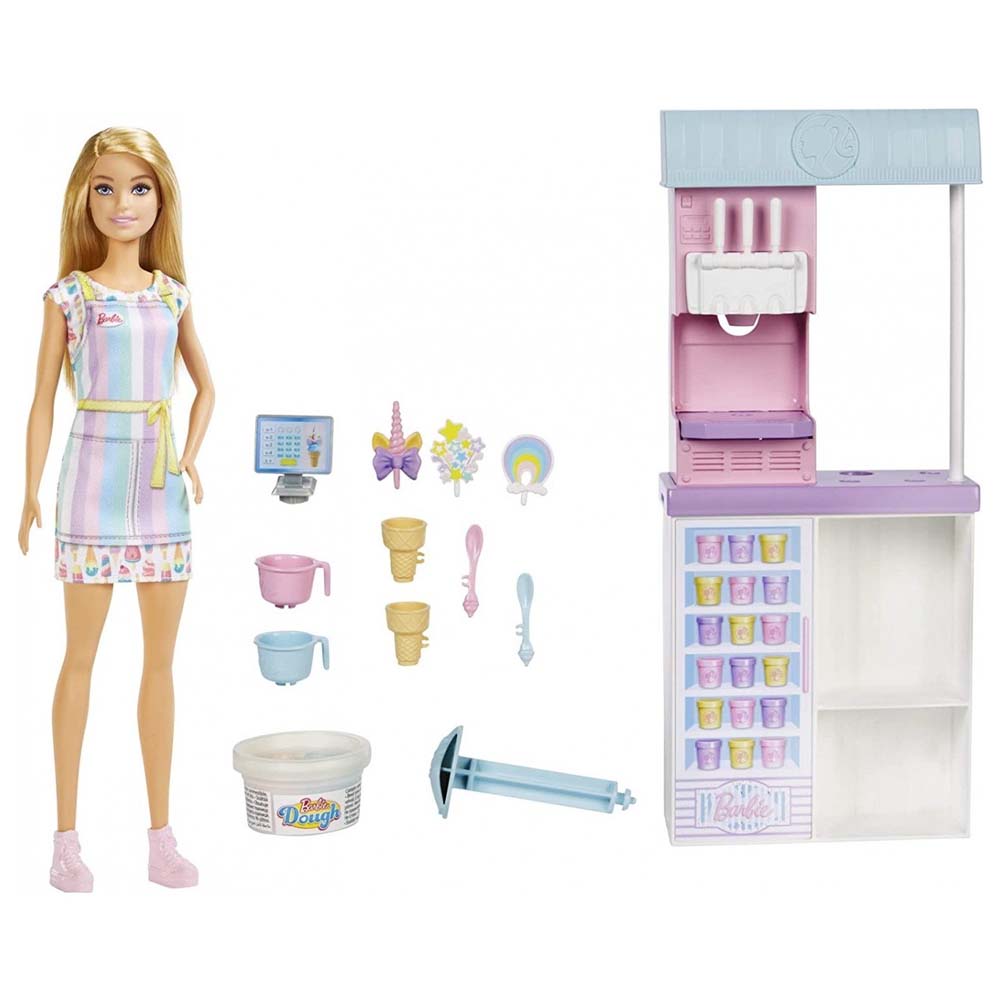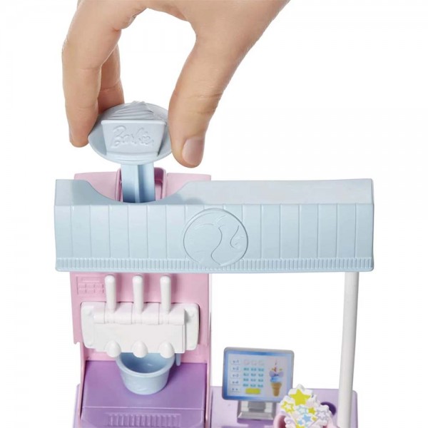 Εξερευνήστε την εμπειρία της λειτουργίας ενός εργαστήριου παγωτού με αυτό το σετ Barbie! Τα παιδιά λατρεύουν τα παγωτά και με αυτό το σετ παιχνιδιού μπορούν να έχουν ένα εργαστήριο για να φτιάξουν λαχταριστά χωνάκια παγωτού. Το σετ περιλαμβάνει κούκλα Barbie (30 εκ.) με φόρεμα με σχέδια παγωτά και ριγέ ποδιά, σταθμό δημιουργίας παγωτού και αξεσουάρ. Τα παιδιά μπορούν να χρησιμοποιήσουν δύο είδη πλαστελίνης (ροζ ή μπλε) και να τη βάλουν στην παγωτομηχανή, να τραβήξουν το μοχλό και να δουν το “παγωτό” να βγαίνει στριφογυριστό. Μπορούν να χρησιμοποιήσουν μπολ ή χωνάκια και να διακοσμήσουν το παγωτό για να ολοκληρώσουν τη γλυκιά λιχουδιά τους! Στη συνέχεια, χτυπήστε την παραγγελία στην ταμειακή μηχανή. Το σετ περιλαμβάνει κούκλα Barbie, σταθμό δημιουργίας παγωτού, 2 χρωματιστές πλαστελίνες.