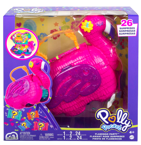 Ένα διασκεδαστικό καλοκαιρινό πάρτι εκπλήξεων με την Polly Pocket! Σε σχήμα φλαμίνγκο, αυτό το μεγάλο σετ έχει λαβή για να το παίρνετε μαζί σας. Τραβήξτε τις προεξοχές και δείτε το πολύχρωμο κομφετί και πάνω από 26 εκπλήξεις να πέφτουν από το σετ! Μερικές ακόμα εκπλήξεις περιμένουν να τις ανακαλύψετε! Ορισμένα αξεσουάρ έχουν προεξοχή για να συνδέονται σε διαφορετικά σημεία του σετ. Το σετ ανοίγει για να αποκαλύψετε διαφορετικά σημεία παιχνιδού και να διασκεδάσετε μαζί με τις δύο φίλες. Υπάρχουν τόσα πολλά διασκεδαστικά πράγματα να κάνετε και να εξερευνήσετε: συνδέστε μια κούκλα στον κορμό του φοίνικα για να σκαρφαλώσει πάνω-κάτω. Συνδέστε τη μαϊμού στο δέντρο και την κούκλα στη μαϊμού και να κουνηθεί. Γυρίστε το μεγάλο φύλλο στην καλύβα για να αποκαλύψετε έναν χώρο διασκέδασης και μια περιστρεφόμενη πίστα χορού. Το σεντούκι του θησαυρού ανοίγει και έχει αποθηκευτικό χώρο. Συνδέστε αξεσουάρ στην οροφή της καλύβας, στην κορυφή του δέντρου, στην παραλία και στο νερό. Τοποθετήστε τη σανίδα του σερφ, το φουσκωτό φλαμίνγκο και το δελφίνι στο κύμα. Υπάρχουν τόσες πολλές εκπλήξεις και ατελείωτες δυνατότητες παιχνιδιού! Τα χρώματα και τα σχέδια μπορεί να διαφέρουν. Ιδανικό δώρο για παιδιά ηλικίας 4 ετών και άνω.