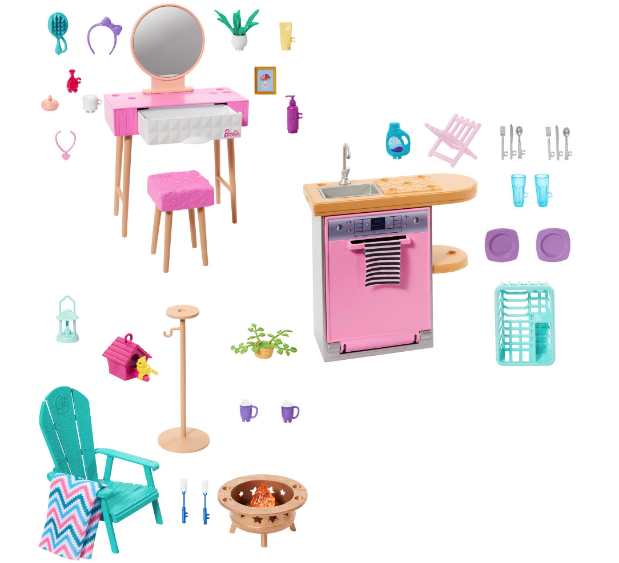 - Οι συσκευασίες επίπλων και αξεσουάρ Barbie εμπνέουν τη φαντασία δημιουργώντας παιχνίδια μίμησης με στιγμές φιλίας, συντροφικότητας και δημιουργικότητας.