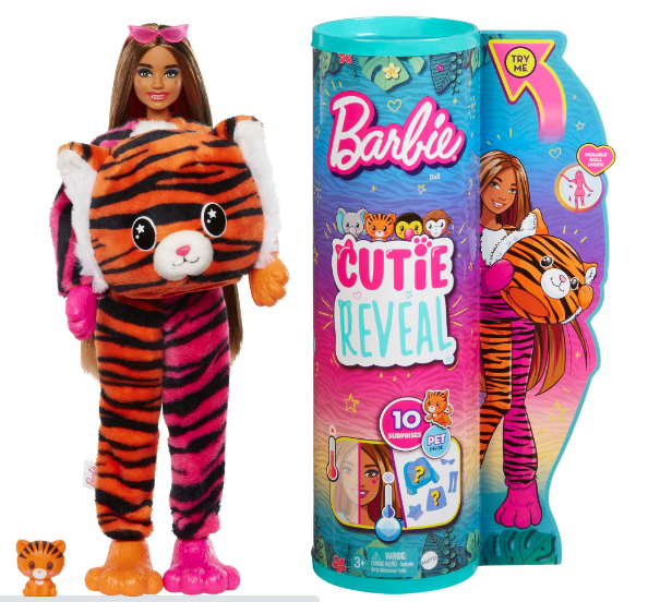 Οι κούκλες Barbie® Cutie Reveal™ της σειράς 'Ζωάκια της Ζούγκλας' προσφέρουν την πιο χαριτωμένη εμπειρία αποκάλυψης με 10 εκπλήξεις! Ανακαλύψτε ένα χαριτωμένο ελεφαντάκι, ένα αξιαγάπητο τιγράκι, ένα ζωηρό παπαγαλάκι ή ένα αστείο μαϊμουδάκι και, στη συνέχεια, αφαιρέστε τη στολή για να αποκαλύψετε μια ευλύγιστη κούκλα Barbie® με μακριά χρωματιστά μαλλιά. Ποια κούκλα θα αποκαλύψετε; Κάθε μικρή κούκλα έχει σχέδια στο πρόσωπο που κάνουν την εμφάνισή της ακόμα πιο χαριτωμένη. Αποκαλύψτε περισσότερες εκπλήξεις, όπως γυαλιά ηλίου, φούστα ή σορτσάκι και ένα μίνι ζωάκι που ταιριάζει με τη στολή της κούκλας. Το επάνω μέρος της στολής αναποδογυρίζει και γίνεται ένα μαλακό τζάκετ, ενώ και το κεφάλι μετατρέπεται σε κρεβάτι για το ζωάκι. Το παγωμένο νερό προσθέτει ακόμα περισσότερα παιχνίδια με την αλλαγή χρώματος της κούκλας και του μικρού ζώου. Το ζεστό νερό επαναφέρει τις εμφανίσεις τους για διασκέδαση ξανά και ξανά! Ανακαλύψτε τις πιο χαριτωμένες εκπλήξεις με αυτή τη σειρά Barbie® Cutie Reveal™. Περιλαμβάνει κούκλα με στολή ζώου και 10 εκπλήξεις. Κάθε κούκλα πωλείται ξεχωριστά, ανάλογα με τη διαθεσιμότητα. Οι κούκλες δεν μπορούν να σταθούν όρθιες από μόνες τους. Τα χρώματα και τα σχέδια μπορεί να διαφέρουν.