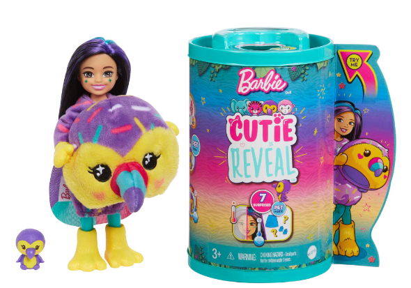 Οι κούκλες Barbie® Cutie Reveal™ της σειράς 'Ζωάκια της Ζούγκλας' προσφέρουν την πιο χαριτωμένη εμπειρία αποκάλυψης με επτά εκπλήξεις! Ανακαλύψτε ένα χαριτωμένο ελεφαντάκι, ένα αξιαγάπητο τιγράκι, ένα ζωηρό παπαγαλάκι ή ένα αστείο μαϊμουδάκι και, στη συνέχεια, αφαιρέστε τη στολή για να αποκαλύψετε μια ευλύγιστη μικρή κούκλα Chelsea™. Ποια κούκλα θα αποκαλύψετε; Κάθε μικρή κούκλα έχει σχέδια στο πρόσωπο που κάνουν την εμφάνισή της ακόμα πιο χαριτωμένη. Αποκαλύψτε περισσότερες εκπλήξεις, όπως μια φούστα και ένα μίνι ζωάκι που ταιριάζει με τη στολή της κούκλας! Το επάνω μέρος της στολής αναποδογυρίζει και γίνεται over-sized μπλούζα, ενώ και το κεφάλι μετατρέπεται σε κρεβάτι για το ζωάκι. Το παγωμένο νερό προσθέτει ακόμα περισσότερα παιχνίδια με την αλλαγή χρώματος της κούκλας και του μικρού ζώου. Το ζεστό νερό επαναφέρει τις εμφανίσεις τους για διασκέδαση ξανά και ξανά! Ανακαλύψτε τις πιο χαριτωμένες εκπλήξεις με αυτή τη σειρά Barbie® Cutie Reveal™. Περιλαμβάνει κούκλα με στολή ζώου και επτά εκπλήξεις. Κάθε κούκλα πωλείται ξεχωριστά, ανάλογα με τη διαθεσιμότητα. Οι κούκλες δεν μπορούν να σταθούν όρθιες από μόνες τους. Τα χρώματα και τα σχέδια μπορεί να διαφέρουν.