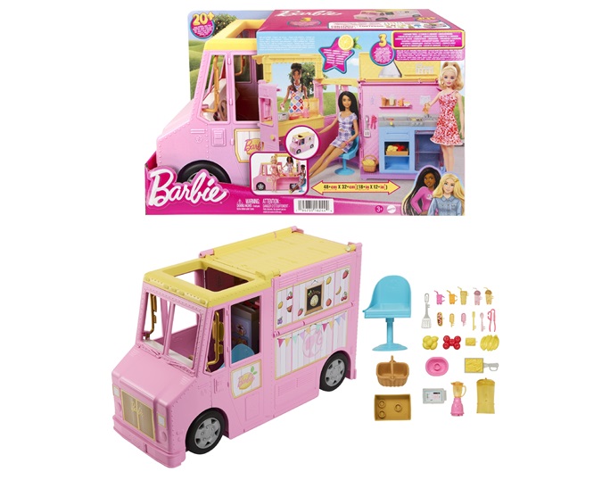 Μπιπ, μπιπ! Με πολύ χαριτωμένες λεπτομέρειες, αυτή η καντίνα έχει όσα χρειάζονται τα παιδιά για να φτιάξουν απολαυστικούς χυμούς φρούτων. Παιχνίδι 2 σε 1: ανοίξτε το όχημα για να αποκαλύψετε τον χώρο της καντίνας ή κλείστε το για να ταξιδέψετε! Το πλαϊνό μέρος του οχήματος μπορεί να μετατραπεί σε υπαίθριο χώρο με πάγκο και καρέκλα. Είναι το τέλειο σκηνικό για μία κούκλα Barbie® που ονειρεύεται να κάνει τη δική της καντίνα! Η κούκλα δεν περιλαμβάνεται.
