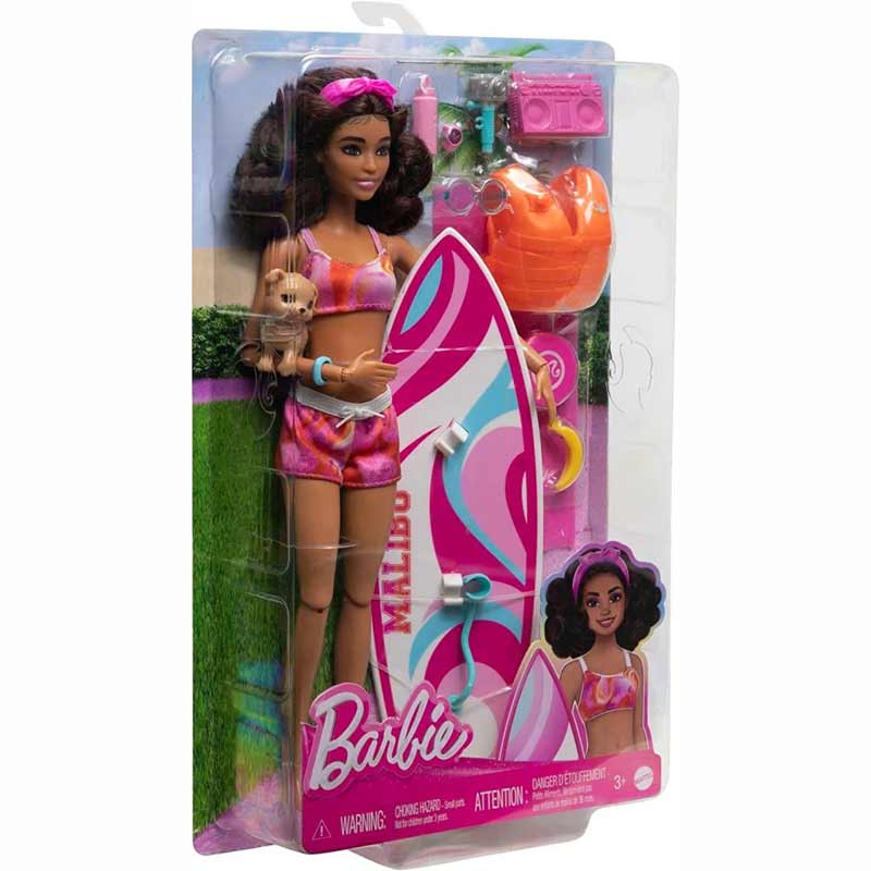 Mattel Barbie Beach Surfer με σανίδα σερφ. Ώρα για σερφ! Τα παιδιά μπορούν να παίξουν στην παραλία με αυτήν την κούκλα Barbie. Έρχεται με μια σανίδα του σερφ, ένα κουτάβι και αξεσουάρ. Η σανίδα του σερφ με αυλακώσεις συγκρατεί την κούκλα στη θέση της με κλιπ ποδιών και λουράκι στον αστράγαλο, ενώ αυτή δαμάζει τα κύματα. Η κούκλα Barbie φοράει σπορ στολή για κολύμπι με κορδέλα και συνοδεύεται από ένα παιχνιδιάρικο κατοικίδιο κουτάβι. Διαθέτει ευλύγιστο σώμα που επιτρέπει ρεαλιστική κίνηση! Στα αξεσουάρ περιλαμβάνονται: σωσίβιο, πετσέτα, στερεοφωνικό, frisbee, γυαλιά ηλίου, μπουκάλι νερό, αντηλιακή λοσιόν, "αδιάβροχη" κάμερα, ρολόι και μπανάνα.
