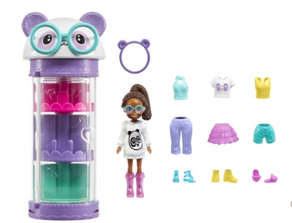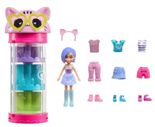 Αυτά τα σετ Polly Pocket™ εμπνέουν τη φαντασία των παιδιών με πολλές διαφορετικές εμφανίσεις. Κάθε σετ περιλαμβάνει μια κούκλα 7,6 εκ. που φοράει φόρεμα και παπούτσια, και επιπλέον 6 ρούχα, 3 ζευγάρια παπούτσια και στέκα με θέμα τα ζώα, όπως πάντα, γατάκι ή σκυλάκι. Τα παιδιά πατούν το επάνω μέρος για να περιστρέψουν την ντουλάπα και να αποκαλύψουν νέους συνδυασμούς ρούχων για να φορέσει η κούκλα! Οι χαριτωμένοι κύλινδροι με θέμα τα ζωάκια είναι ιδανικοί για παιχνίδι στη βόλτα.
