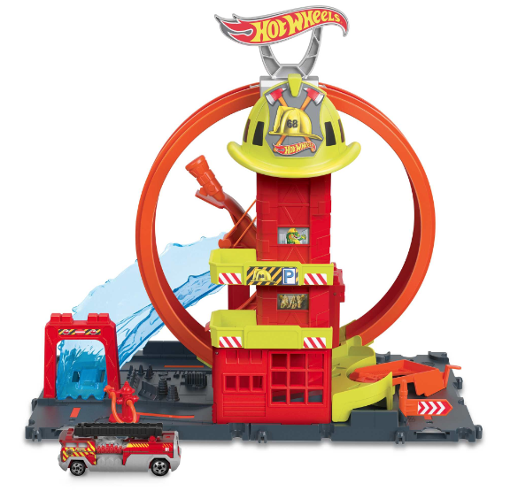 Το σετ παιχνιδιού Hot Wheels™ City Πίστα Πυροσβεστικός Σταθμός βασίζεται σε ένα αγαπημένο θέμα των παιδιών με ένα πολυεπίπεδο, ρυθμιζόμενο λουπ και προωθητή που ωθεί τα αυτοκίνητα μέσα από τον σταθμό και κάτω από μια ημιδιαφανή ράμπα που μοιάζει με νερό. Η βάση διαθέτει συναρπαστικές λεπτομέρειες που εμπνέουν τη δημιουργική αφήγηση, καθώς και συνδέσμους για να τη συνδέσετε με άλλα σετ Hot Wheels. Κάθε σετ πωλείται ξεχωριστά, ανάλογα με τη διαθεσιμότητα. Περιλαμβάνεται ένα πυροσβεστικό όχημα Hot Wheels. Τα χρώματα και τα σχέδια μπορεί να διαφέρουν.