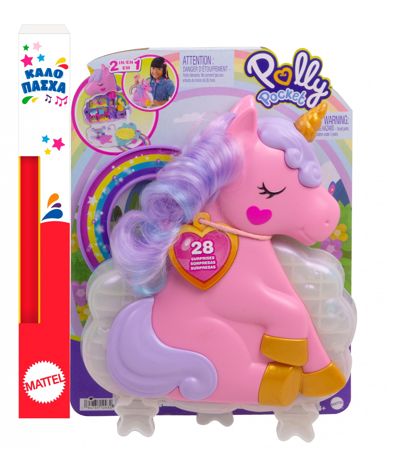 Διασκεδάστε στο υπέροχο Σαλόνι Ομορφιάς της Polly Pocket! Ιδανικό για παιχνίδι μέσα ή έξω από το σπίτι, αυτό το σετ έχει σχήμα μονόκερου με όμορφα πολύχρωμα μαλλιά που τα παιδιά μπορούν να παίξουν και να διακοσμήσουν! Ανοίξτε το σετ για να αποκαλύψετε ένα απίθανο σαλόνι ομορφιάς, εμπνευσμένο από τον μονόκερο, με δημιουργικές δραστηριότητες! Περιλαμβάνει 2 κούκλες και 26 αξεσουάρ παιχνιδιού για τα μαλλιά, όπως 2 κλιπ για τη διακόσμηση των μαλλιών του μονόκερου.Έχει επίσης λαβή-ουράνιο τόξο για να μπορούν εύκολα τα παιδιά να το μεταφέρουν όπου θέλουν!