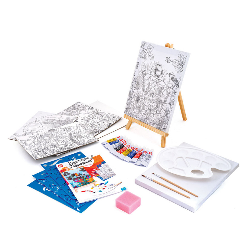 Το Εργαστήριο Ζωγραφικής Aκρυλικό είναι το ιδανικό σετ για να μάθει το παιδί να ζωγραφίζει με την τεχνική του ακρυλικού. Σχεδιάστε πίνακες σε καμβά επάνω στο ξύλινο καβαλέτο που περιλαμβάνεται και δώστε ζωή στα προτυπωμένα σχέδια. Είναι κατάλληλο για παιδιά που έχουν την πρώτη τους εμπειρία αφή με την τεχνική του ακρυλικού, καθώς περιέχει εικονογραφημένο αναλυτικό οδηγό που καθοδηγεί βήμα - βήμα το παιδί στην πρώτη του επαφή και την εξοικείωσή του με την τεχνική. Επιπλέον, είναι εξίσου κατάλληλο και για παιδιά που έχουν ήδη αποκτήσει εμπειρία, καθώς το πλούσιο περιεχόμενό του τους δίνει τη δυνατότητα να χρωματίσουν προ-τυπωμένες καρτολίνες, να δημιουργήσουν τα δικά τους έργα από την αρχή σε λευκό καμβά χρησιμοποιώντας τα stencils που περιλαμβάνονται, αλλά και να εξασκήσουν περαιτέρω τη φαντασία και το ταλέντο τους σε ελεύθερο σχέδιο. Το σετ περιλαμβάνει : ξύλινο καβαλέτο 36x20cm παλέτα 2 καμβάδες ( 27x20cm,1 προτυπωμένο και 1 λευκό) 4 καρτολίνες σε 2 μεγέθη (3 προτυπωμένες και 1 λευκή) 10 ακρυλικά χρώματα (1 μαύρο, 2 κόκκινα, 2 κίτρινα, 2 μπλε, 3 άσπρα) 2 διαφορετικά πινέλα 3 φύλλα stencils. Τα Εργαστήρια Ζωγραφικής AS είναι μια σειρά εκπαιδευτικών σετ ζωγραφικής που οδηγούν το παιδί να γίνει ένας αληθινός μικρός ζωγράφος. Ανάμεσα στα Εργαστήρια Ζωγραφικής θα βρείτε πολλές επιλογές θεματολογίας για να επιλέξετε αυτό που σας αρέσει περισσότερο και να δημιουργήσετε υπέροχα σχέδια. Τόσο το πλούσιο ζωγραφικό τους περιεχόμενο, όσο και η πληθώρα χρήσιμων συμβουλών και οδηγιών που περιλαμβάνουν για τα πρώτα βήματά σας στη ζωγραφική, θα φέρουν το παιδί όλο και πιο κοντά στην τέχνη αυτή, βοηθώντας το να καλλιεργήσει τις ικανότητές του με τον πιο διασκεδαστικό τρόπο. Η σειρά συμβάλλει στην ανάπτυξη της φαντασίας και της δημιουργικότητας των παιδιών, εξασκώντας παράλληλα τη λεπτή κινητικότητάς τους αλλά και το συντονισμό ματιού-χεριού κατά τη χρήση των πινέλων.