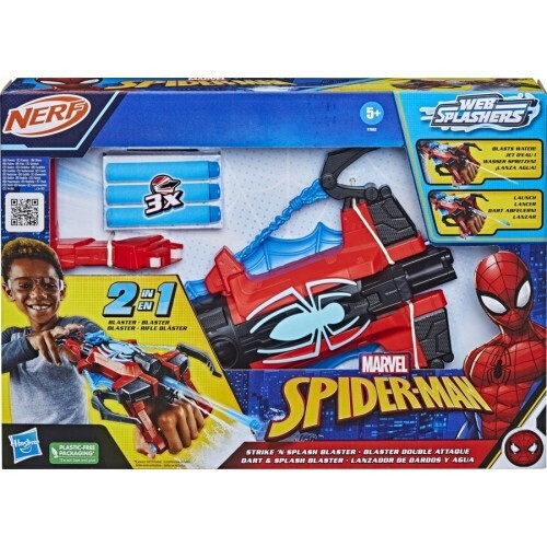 Δύο διαφορετικοί κόσμοι συγκρούονται σε αυτό το Strike N Splash Blaster! Το Nerf και ο Spider-Man συνεργάζονται σε ένα επικό παιχνίδι που εκτοξεύει “ιστό”. Ακινητοποιήστε τους αντιπάλους σας με βελάκια και ενεργοποιήστε τη λειτουργία εκτόξευσης νερού του παιχνιδιού με το πάτημα ενός κουμπιού. Τα παιδιά θα λατρέψουν να προσποιούνται ότι είναι ο κλασικός σούπερ ήρωας που εκτοξεύει ιστό της Marvel με μια ανατροπή. Αυτό το Spider-Man Strike N Splash Nerf Blaster κάνει το τέλειο δώρο για τους θαυμαστές Marvel και Nerf ηλικίας 5 ετών και άνω