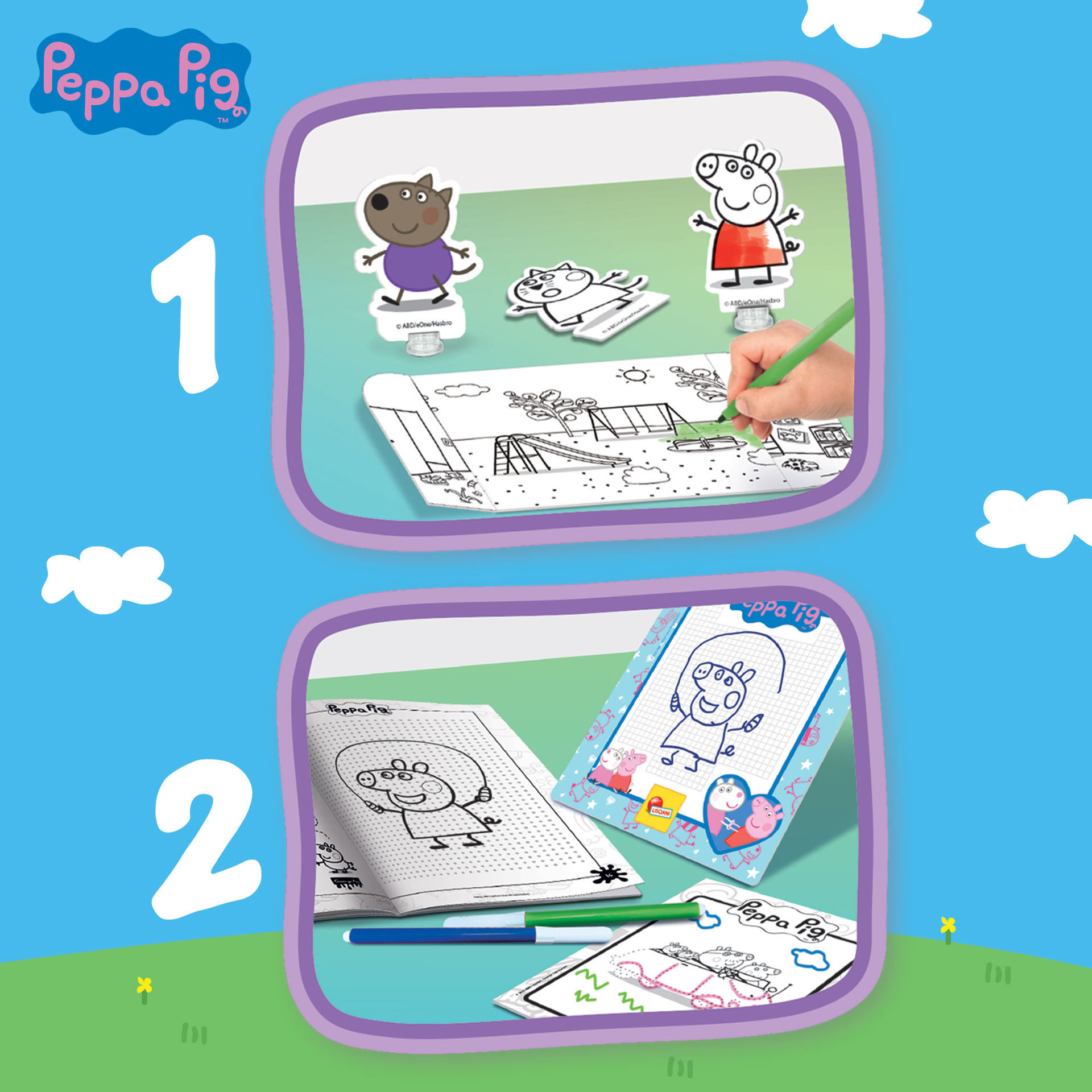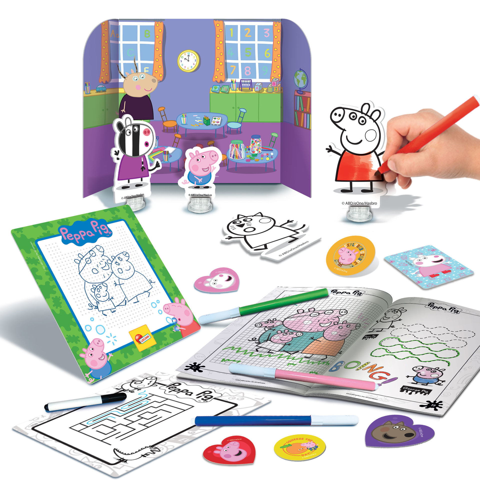Σχεδιάστε και χρωματίστε την Peppa Pig και τους φίλους της με αυτή τη νέα σχολή σχεδίου, διαθέσιμη τώρα σε αυτή τη νέα πρακτική μορφή μεταφοράς, ώστε να μπορείτε να την έχετε μαζί σας όπου κι αν πάτε. Όλα περιέχονται σε ένα πρωτότυπο σακίδιο, ιδανικό για το σχολείο ή άλλες καθημερινές περιπέτειες!