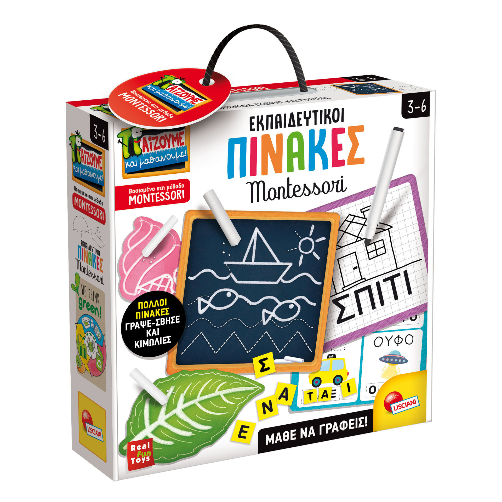 Επιπλέον, πολλές πλάκες σε σχήμα. Μια πραγματική σχολή γραφής βασισμένη στη μέθοδο Montessori σύμφωνα με την οποία ο χειρισμός των υλικών είναι μια συγκεκριμένη εμπειρία που κάνει τη μάθηση πιο αποτελεσματική.
