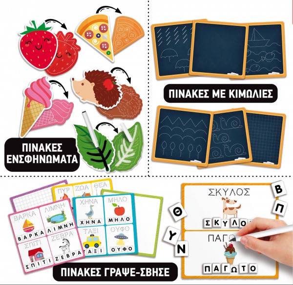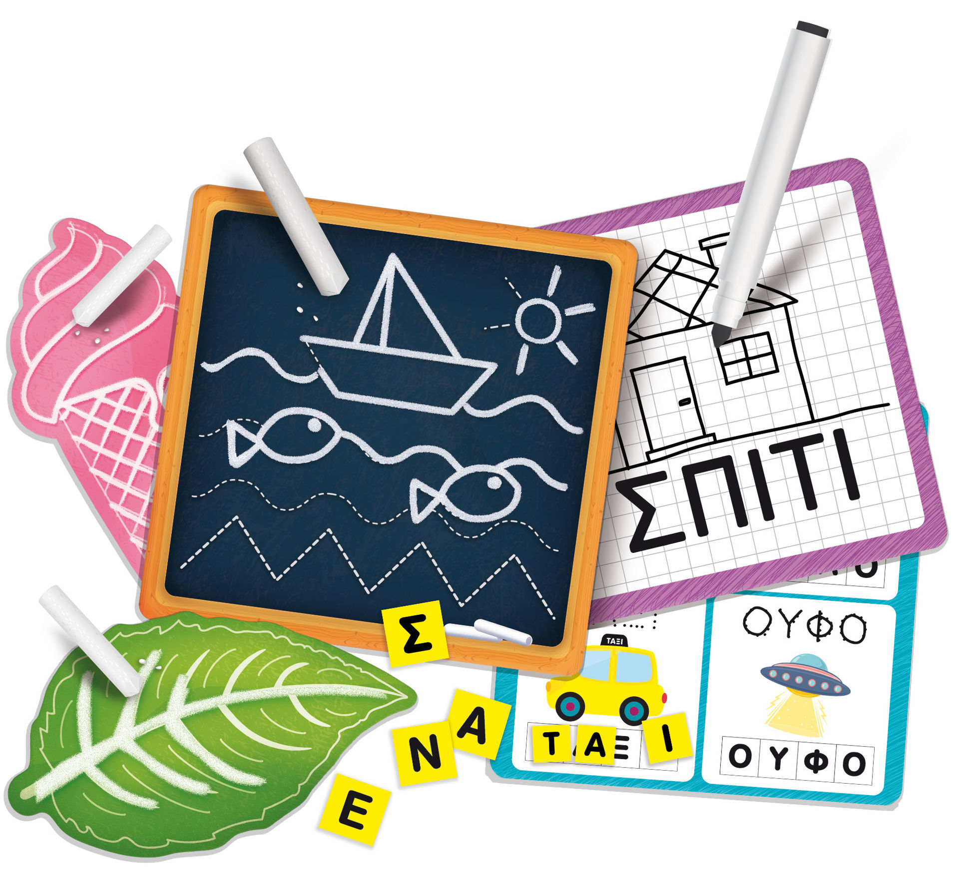 • 6 πίνακες διπλής όψης • 5 καρτέλες όψης • 80 γράμματα • Μαρκαδόρος που σβήνει • Ειδικό σφουγγάρι για πλύσιμο • 2 κιμωλίες • Οδηγίες