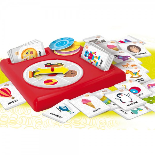 ΠΕΡΙΕΧΟΜΕΝΑ • 9 κάρτες με ζώα • 9 κάρτες με φαγητά • 9 κάρτες με μεταφορικά μέσα • 9 κάρτες με παιχνίδια • 4 κονκάρδες • Τροχός διπλής όψης με βελάκι • Πλαστική βάση • Οδηγίες