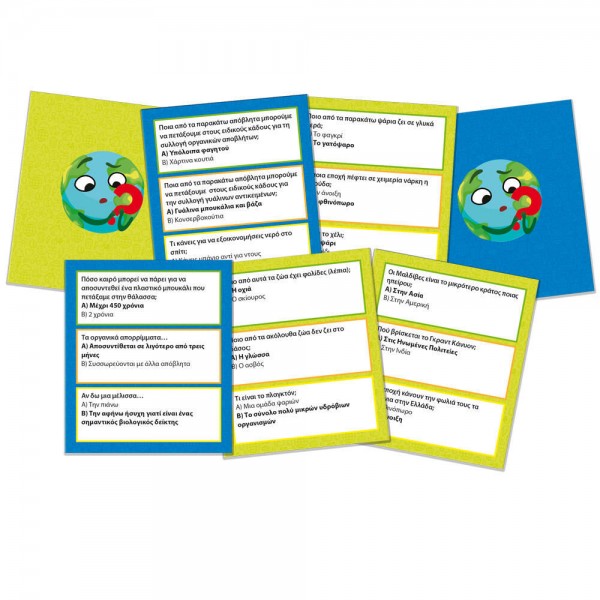 Περιεχόμενα: • Τρισδιάστατος πλανήτης • 24 μάρκες «Σώσε το περιβάλλον» • Τροχός με βελάκι • 56 κάρτες • 4 φάκελοι περιβάλλοντος • 50 βραβεία • Οδηγίες