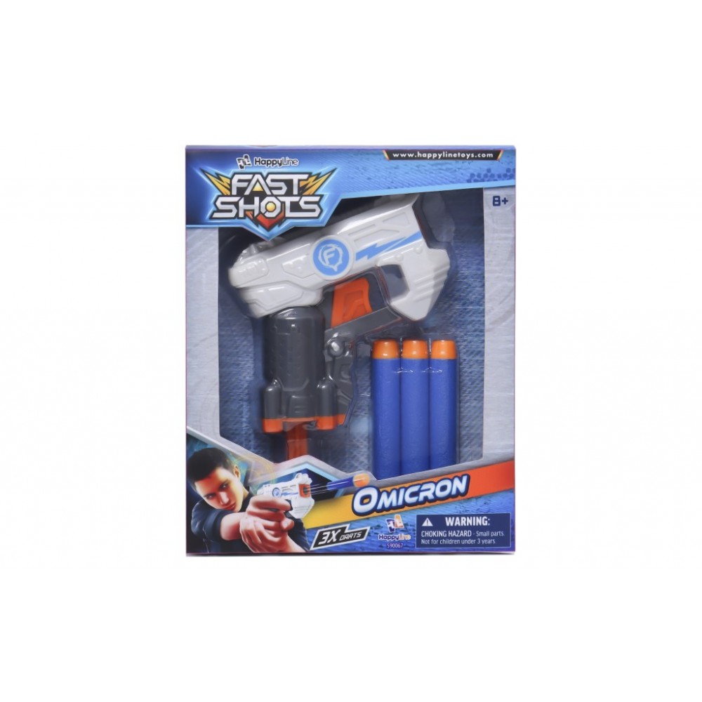Fast Shots Omicron με 3 βολίδες αφρού. Fast Shots όπλα αφρού! Σου δίνουν την δυνατότητα να διασκεδάσεις με τους φίλους σου, να σκοπεύσεις από μακριά, να επαναφορτώσεις εύκολα και να πετύχεις τον στόχο σου πριν σε καταλάβουν. Ζήσε τον ενθουσιασμό της σκοποβολής και την πρόκληση του να νικήσεις τους αντιπάλους σου σε ένα παιχνίδι αποκλεισμού. Με το Omicron πατώντας την σκανδάλη εκτοξεύεις τις βολίδες αφρού μακριά. Περιέχονται 3 βολίδες αφρού. Κατάλληλο για παιδιά +8ετών.