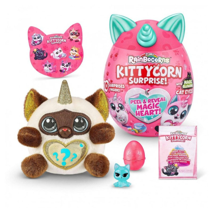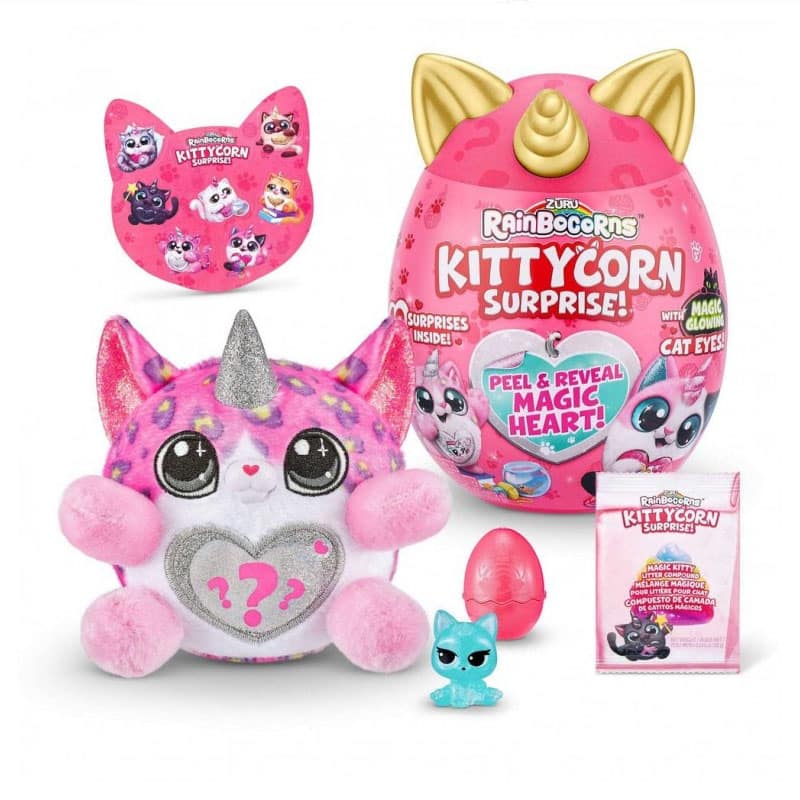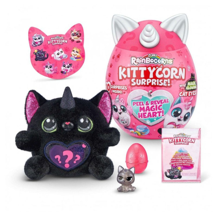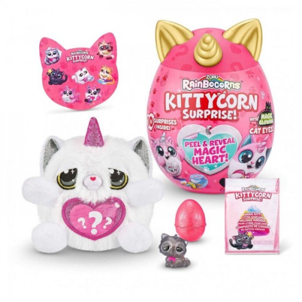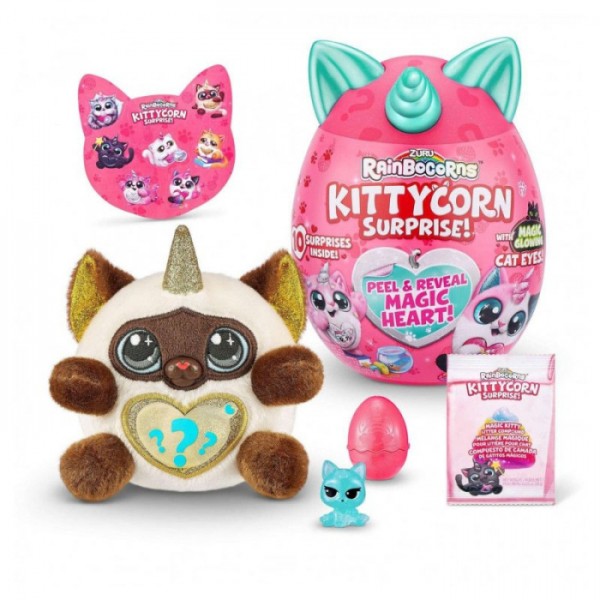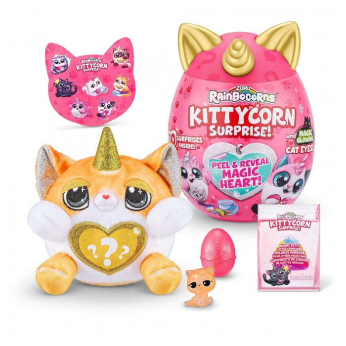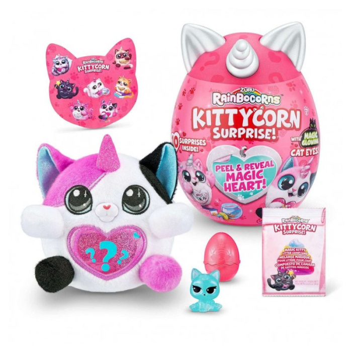 Περιλαμβάνονται: Kittycorn egg, Kittycorn βελούδινο Boo-boocorn αυγό, Γατάκι boo-boocorn, πακέτο αυτοκόλλητων, οδηγός συλλεκτών, rainbocorns jelly slime poop και peel ‘n’ που αποκαλύπτουν τη μαγική καρδιά.