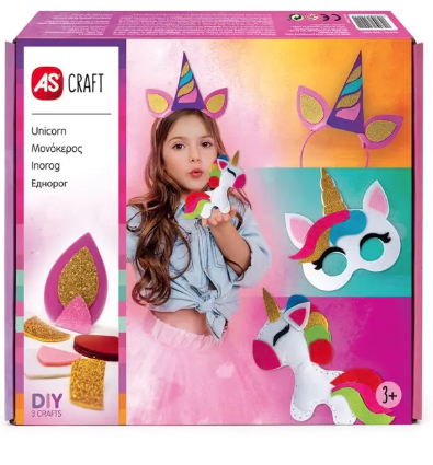 Φτιάξτε τις δικές σας κατασκευές και μπείτε στον ονειρικό κόσμο των μονόκερων. Μάσκα, στέκα και χνουδωτό ζωάκι μονόκερος, ειδικά σχεδιασμένα από μαλακά και ασφαλή υλικά για δημιουργική κατασκευή από παιδιά.
