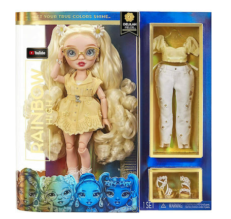 Οι Rainbow High σας καλωσορίζουν στη πιο πολύχρωμη Σχολή Μόδας! Εδώ, όπου οι μαθητές ακολουθούν τα πιο δημιουργικά τους όνειρα και κάθε ένας αντιπροσωπεύει το δικό του χρώμα και μοναδικό στυλ δημιουργώντας όλοι μαζί το πιο μαγικό Ουράνιο Τόξο! Γνώρισε την Delilah Fields (Buttercup)! Με υπέροχο μοναδικό στυλ, διαθέτει από 2 ολοκληρωμένα διαφορετικά σύνολα ένδυσης και πολλά αξεσουάρ για να είναι πάντα «in! Ανακάλυψε και τις φίλες της και δες πως όταν τις βάζετε στη σειρά θα ανακαλύψετε όλα τα χρώματα του Ουράνιου Τόξου! Βρες το δικό σου στυλ! Διάλεξε την αγαπημένη σου Rainbow High! Διαθέτουν υπέροχα μακριά μαλλιά σε φανταστικά χρώματα. Η κάθε συσκευασία περιλαμβάνει : 2 πλήρη σετ ρούχων & μια κρεμάστρα, 2 ζευγάρια παπούτσια, 1 χτένα, 2 κρεμάστρες, 1 σταντ για την κούκλα και αξεσουάρ μόδας: σκουλαρίκια, τσάντες, κλπ.