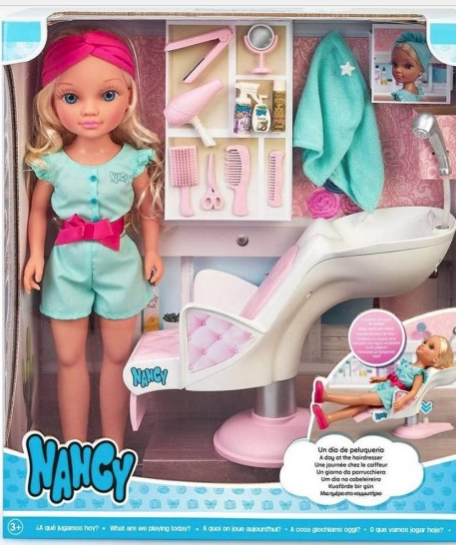 Nancy, τι παίζουμε σήμερα; Ημέρα περιποίησης και ομορφιάς στο κομμωτήριο! Λούσε τα μαλλιά της κούκλας Nancy στο λουτήρα που λειτουργεί αληθινά με νερό! Δώσε απίθανο στυλ στα μαλλιά της με τα πολλά αξεσουάρ που περιέχονται!