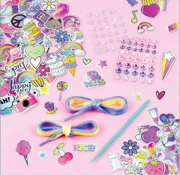 Sticker Chic: Προσωρινά τατουάζ για παπούτσια! Κάντε και ξανακάντε. Οι Tweens μπορούν να δώσουν λάμψη στα υποδήματά τους με διακοσμητικά αυτοκόλλητα. Προσθέστε λίγο ή προσθέστε πολλά. Μεταμορφώστε τα παπούτσια ξανά και ξανά με αυτοκόλλητα που αφαιρούνται εύκολα. Πολύχρωμη διακόσμηση παπουτσιών για ουράνιο τόξο street style πινελιά! Περιλαμβάνει κορδόνια παπουτσιών και διασκεδαστικές χαλκομανίες mylar (ξεκολλάει η κόλλα — αφαιρέστε τυχόν περίσσεια με ζεστό νερό). Δεν συνιστάται για ορισμένες κατασκευές παπουτσιών. Ζητήστε την άδεια ενός γονέα πριν στολίσετε παπούτσια.