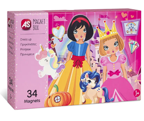 Οι πριγκίπισσες του Magnet Box σας περιμένουν να τις ανακαλύψετε, συνδυάζοντας 34 χάρτινους μαγνήτες με διαφορετικά φορέματα, χτενίσματα και άλλα αξεσουάρ. Μπορείτε να ακολουθήσετε τις προτάσεις στις 7 κάρτες που περιλαμβάνονται ή να δημιουργήσετε πριγκίπισσες της φαντασίας σας.