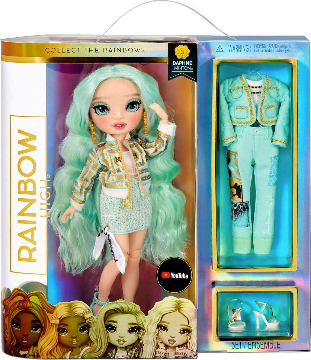 Οι Rainbow High σας καλωσορίζουν στη πιο πολύχρωμη Σχολή Μόδας! Εδώ, όπου οι μαθητές ακολουθούν τα πιο δημιουργικά τους όνειρα και κάθε ένας αντιπροσωπεύει το δικό του χρώμα και μοναδικό στυλ δημιουργώντας όλοι μαζί το πιο μαγικό Ουράνιο Τόξο! Γνώρισε την DAPHNE MINTON! Έχει μοναδικό στυλ και το αγαπημένο της χρώμα είναι η μέντα! Εξάλλου είναι πανέμορφη και το χρώμα αυτό ταιριάζει πολύ και με τα μακριά πλούσια μαλλιά της. Η DAPHNE διαθέτει 2 ολοκληρωμένα διαφορετικά σύνολα ένδυσης και πολλά αξεσουάρ στο αγαπημένο της χρώμα για να είναι πάντα «in!