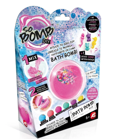 Φτιάξε τη δική σου αφρίζουσα βόμβα μπάνιου αναμειγνύοντας πολύχρωμες σκόνες και διακοσμητικά.