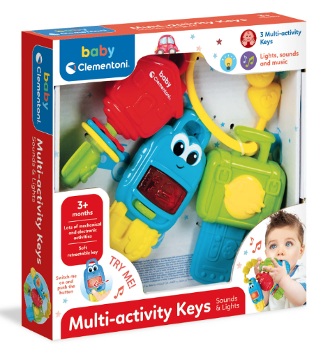 Ηλεκτρονική μουσική κουδουνίστρα με πολύχρωμα εφέ φωτισμού. Διαθέτει 3 παιχνίδια σε 1, καθώς κάθε κλειδί έχει τη δική του λειτουργία για να διεγείρει την ακοή, το άγγιγμα και την επιδεξιότητα. Υπάρχουν και μαλακά μέρη κατάλληλα για οδοντοφυία.