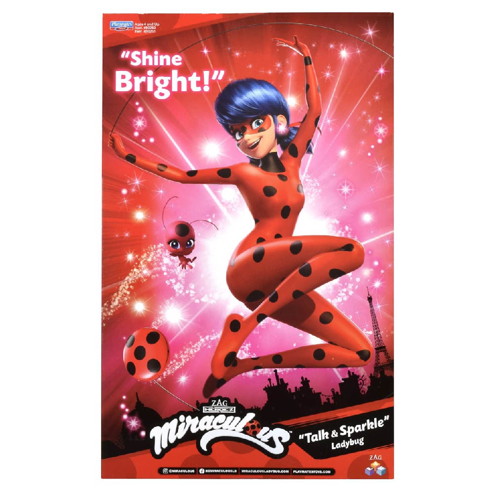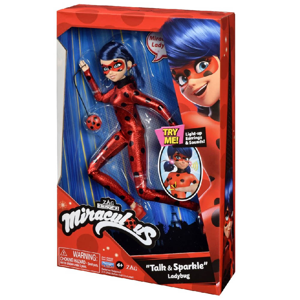 Η Miraculous Ladybug ενθαρρύνει τα παιδιά όλων των ηλικιών να βρουν τον σούπερ ήρωα που κρύβουν μέσα τους! Ζήστε τη μαγεία της Miraculous Ladybug με την κούκλα 27 εκ. με 15 σημεία άρθρωσης, Talk & Sparkle Ladybug. Η Ladybug είναι ντυμένη με μια νέα λαμπερή στολή με φωτιζόμενα σκουλαρίκια Miraculous! Απλά πατήστε το κουμπί στο στήθος της για να δείτε τα μαγικά της σκουλαρίκια να ανάβουν και να ακούσετε φράσεις από την τηλεοπτική σειρά (στα αγγλικά). Τα παπούτσια, η μάσκα και τα σκουλαρίκια αφαιρούνται ενώ περιέχεται και η Tikki. Κατάλληλο για παιδιά ηλικίας 3+.