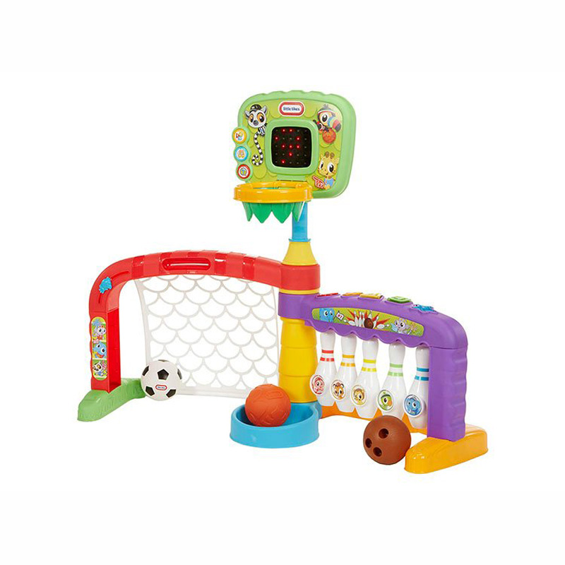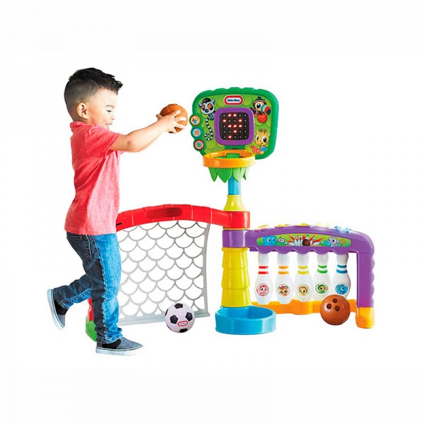 Little Tikes Αθλητικό Γυμναστηριο 3 σε 1 Τριπλό παιχνίδι για μοναδική άθληση & διασκέδαση! Ανακαλύψτε το αγαπημένο του άθλημα μέσα από το παιχνίδι! Οι μικροί αθλητές μπορούν να καρφώνουν, να σουτάρουν ή να σκοράρουν με το σπορ που θα επιλέξουν ανά πάσα στιγμή: Μπάσκετ, ποδόσφαιρο ή μπόουλινγκ! Κύρια Χαρακτηριστικά: 3 τρόποι παιχνιδιού: 1. εκπαιδευτικό -> μαθαίνουν αριθμούς, χρώματα και σχήματα. 2. παιχνίδι κίνησης με ήχους και φώτα. 3. άθληση -> 3 αθλήματα σε 1 ( μπάσκετ, ποδόσφαιρο, μπόουλινγκ). Η συσκευασία περιέχει 3 διαφορετικές μπάλες για κάθε άθλημα. Περιέχει ταμπλό, που φωτίζει και μετράει καλάθια, πάνω από 75 χαρούμενους ήχους και φράσεις (στα αγγλικά) που ενθαρρύνουν την κίνηση & την προσπάθεια του παιδιού. Η μπασκέτα διαθέτει ρυθμιζόμενο ύψος για το στεφάνι για να ακολουθεί το μικρό σας αθλητή σε κάθε του προπόνηση όσο μεγαλώνει. Ρυθμιζόμενο ταμπλό καθ' ύψος. Το σετ διπλώνει για εύκολη αποθήκευση.