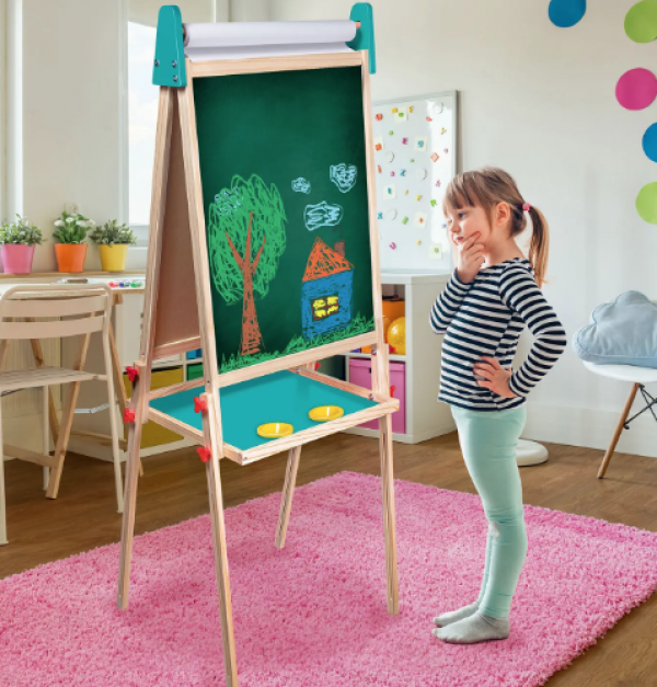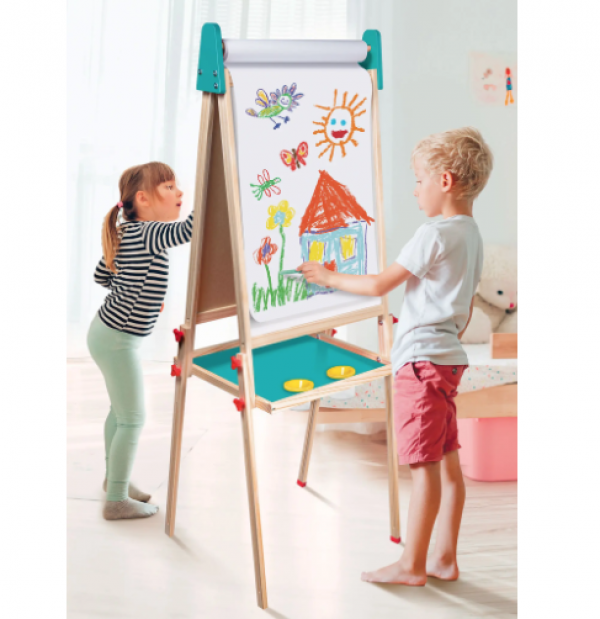 Ο μαγνητικός επιδαπέδιος πίνακας Mega Easel Deluxe αποτελεί ένα εργαλείο πολλαπλών χρήσεων, το οποίο συνδυάζει 4 τύπους δημιουργικής απασχόλησης για το παιδί μέσω του πίνακα μαρκαδόρου, του μαυροπίνακα, της ζωγραφικής σε ρολό χαρτί και του παιχνιδιού με μαγνήτες.