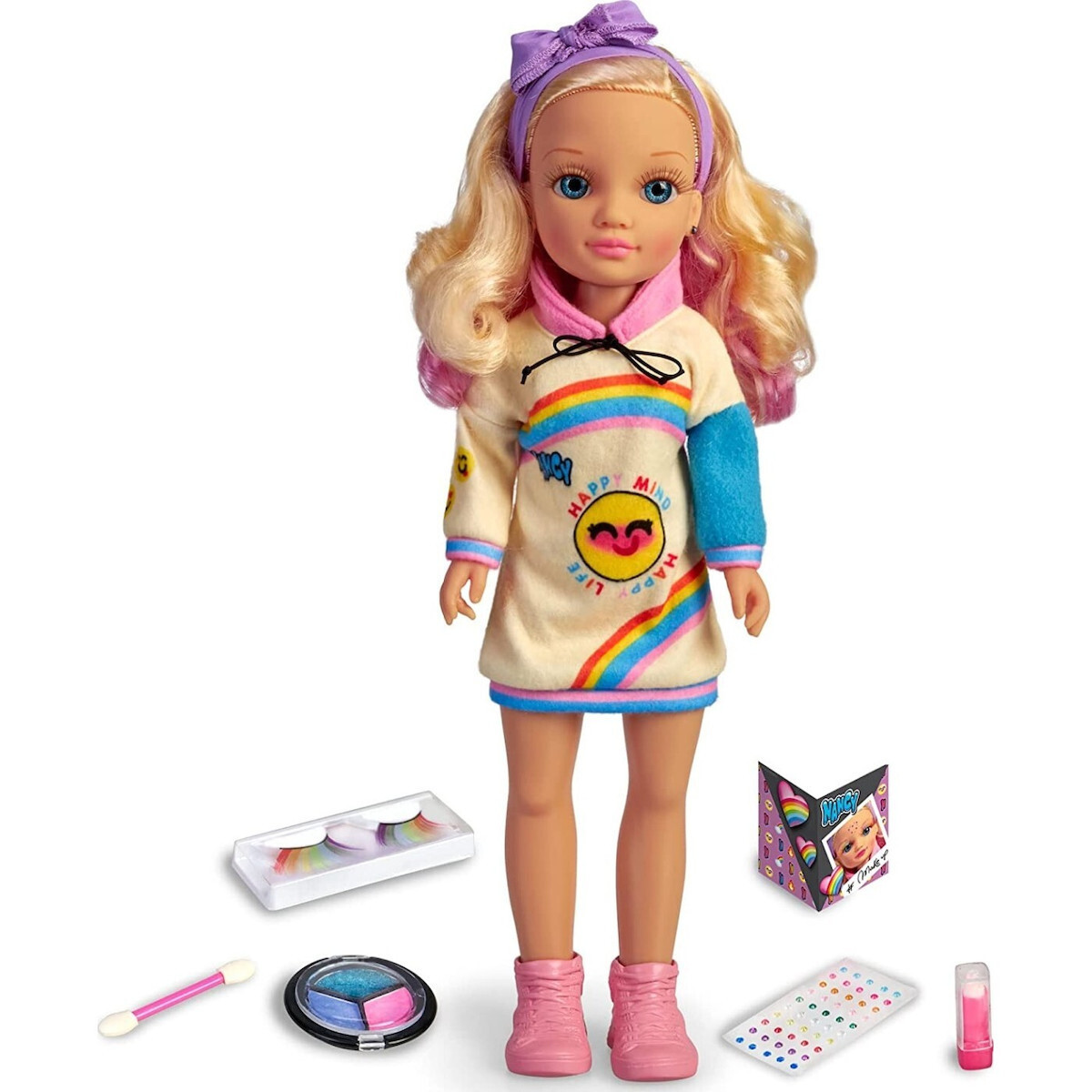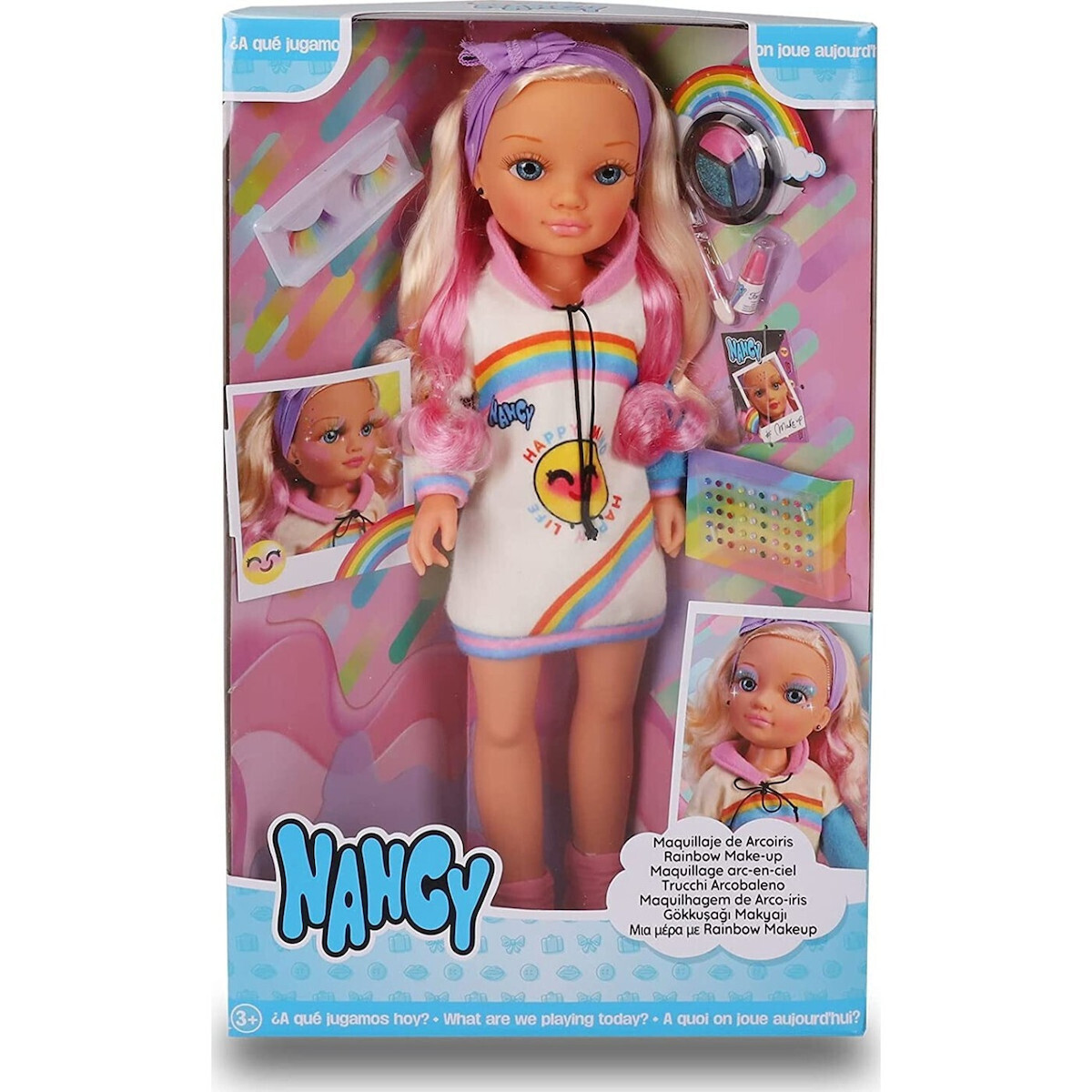 Nancy,τι παίζουμε σήμερα; Σήμερα κάνουμε μακιγιάζ στα χρώματα του ουράνιου τόξου! Κούκλα Nancy με υπέροχο φόρεμα-φούτερ και πολλά αξεσουάρ για να της κάνετε το μακιγιάζ. Φoρέστε της τις βλεφαρίδες στα χρώματα του ουράνιου τόξου, διακοσμήστε τη με στρασάκια, προσθέστε λίγη σκιά ματιών, κραγιόν και έτοιμη στην στιγμή! Η συσκευασία περιέχει: 1 κούκλα 43 ετώνκ. με φόρεμα φούτερ και παπούτσια, 1 αξεσουάρ κορδέλα για την κούκλα, 1 ζευγάρι Rainbow βλεφαρίδες, 1 καρτέλα με στρασάκια/σκουλαρίκια, 1 παλέτα σκιών και κραγιόν (μόνο για χρήση στην κούκλα).
