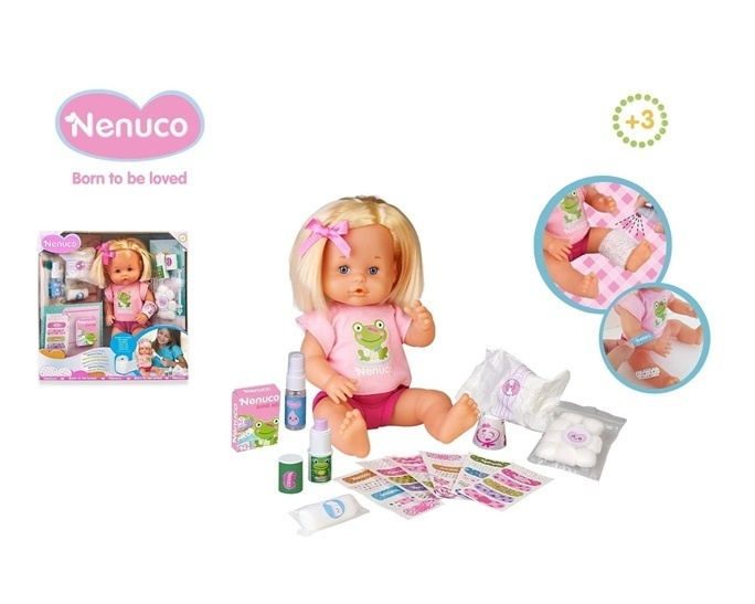 Nenuco Born to be Loved! Ένα τρυφερό μωράκι που ζητά τη φροντίδα σου! Σετ παιχνιδιού με πολλά διαφορετικά αξεσουάρ & κούκλα-μωρό ύψους 35 εκ. Η Nenuco χτύπησε και περιμένει τη φροντίδα σας! Βάλτε της πολύχρωμο τσιρότο, καθάριστε την πληγούλα με το βαμβάκι και ρίξτε σπρέυ! Με λίγο νερό ο επίδεσμος γίνεται γύψος. Δέστε το στο χτύπημα του μωρού για να γίνει εντελώς καλά! Η κούκλα έχει ξανθά μαλλάκια, ρουχαλάκια και φιόγκο στα μαλλιά. Ατελείωτο παιχνίδι ρόλων & φροντίδας με 10 διαφορετικά αξεσουάρ. Δεν απαιτούνται μπαταρίες.