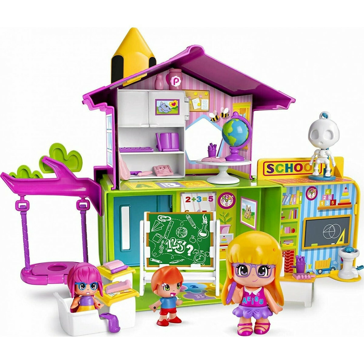 Pinypon Σχολείο! Θρανία και πίνακας έτοιμα, το μάθημα ξεκινάει! Μαθαίνουμε γεωγραφία, μαθηματικά, φυσική στην αίθουσα πειραμάτων, μουσική και καλλιτεχνικά. Ντριιιιν, το κουδούνι, ώρα για διάλειμμα! Γρήγορα στο προαύλιο για μπάσκετ και κούνια.