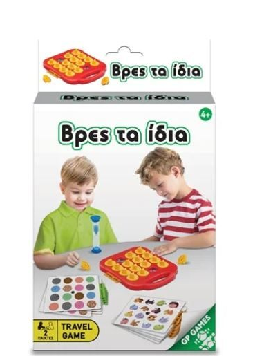 Επιτραπέζιο ταξιδίου “Βρες τα Ίδια” Πρακτικό, συμπαγές και εύκολο στη μεταφορά – κατάλληλο για παιχνίδι σε κάθε ταξίδι! Τοποθετήστε μια από τις θεματικές καρτέλες μέσα στη βάση παιχνιδιού που περιέχεται, και προσπαθήστε να απομνημονεύσετε όσα περισσότερα ζευγάρια εικόνων μπορείτε μέσα σε 30 δευτερόλεπτα. Καλύψτε με τα καπάκια και όποιος βρει τα περισσότερα ζευγάρια εικόνων είναι ο νικητής!