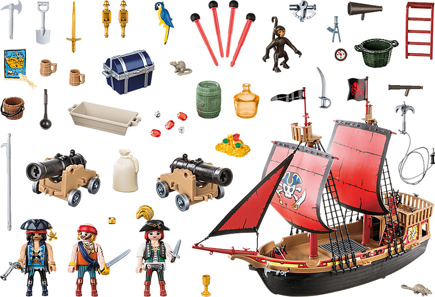 Πειρατική Ναυαρχίδα με τρεις πειρατές και πολλά αξεσουάρ. Μπείτε στο εσωτερικό του καραβιού από τη μεγάλη καταπακτή στη μέση του καταστρώματος. Το καράβι επιπλέει. Κατάλληλο για παιδιά ηλικίας 5+ ετών.