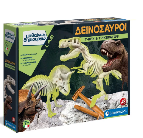 Ετοιμάσου για ένα συναρπαστικό ταξίδι στο παρελθόν! Με τα εργαλεία ενός παλαιοντολόγου, το σφυρί και το καλέμι μπορείς να σκάψεις και να ξεθάψεις τα αρχαία απολιθώματα δύο φοβερών δεινοσαύρων: του Τυραννόσαυρου και του Τρικεράτωπα. Συναρμολόγησε τους σκελετούς του T-rex και Τρικεράτοπα και δες τους να φωσφορίζουν στο σκοτάδι!